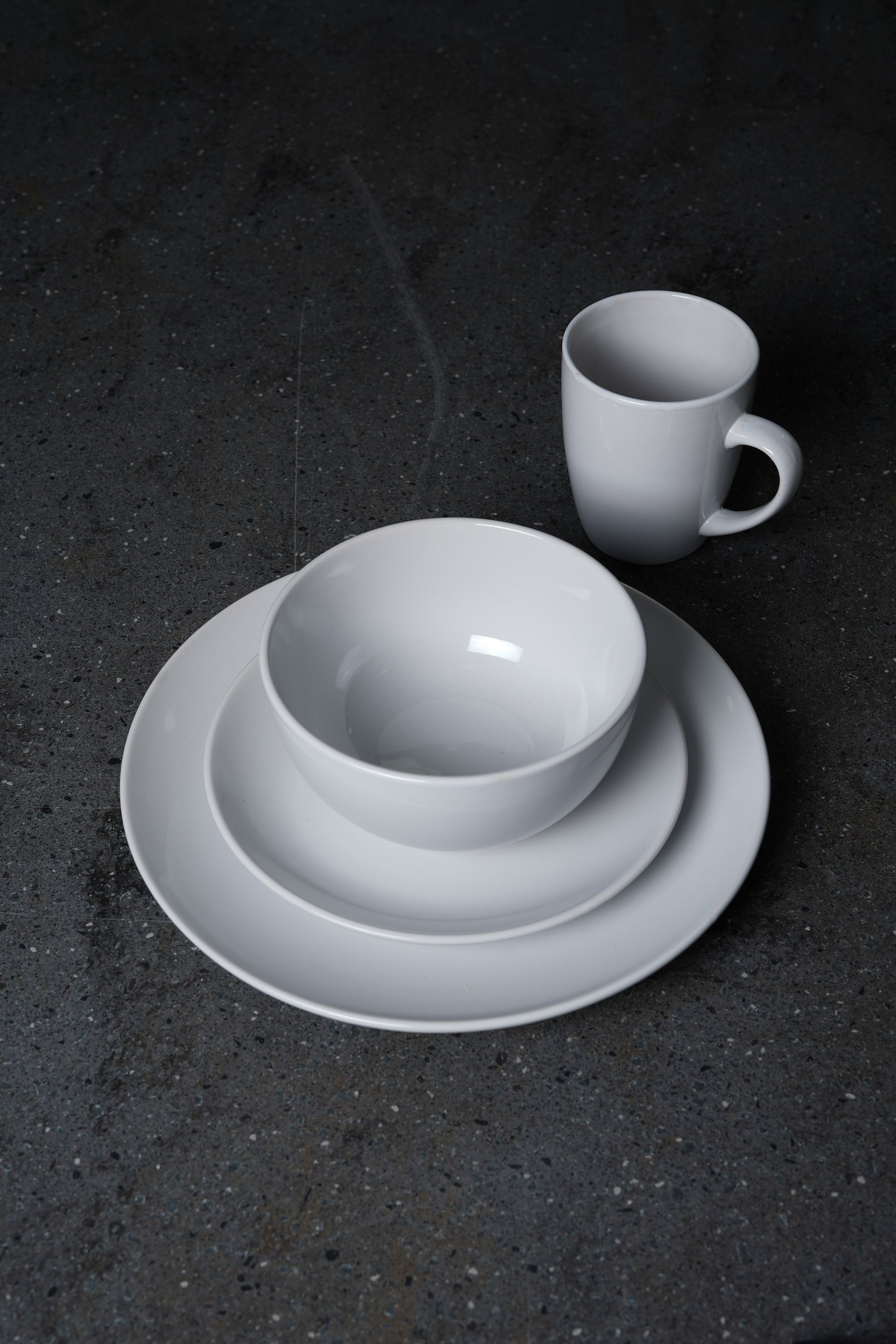 Modern 16-piece ceramic dinnerware set in bright white finish. Contemporary square design serves 4 people with dinner plate, salad plate, bowl, and mug per setting. Crisp lines and timeless elegance.